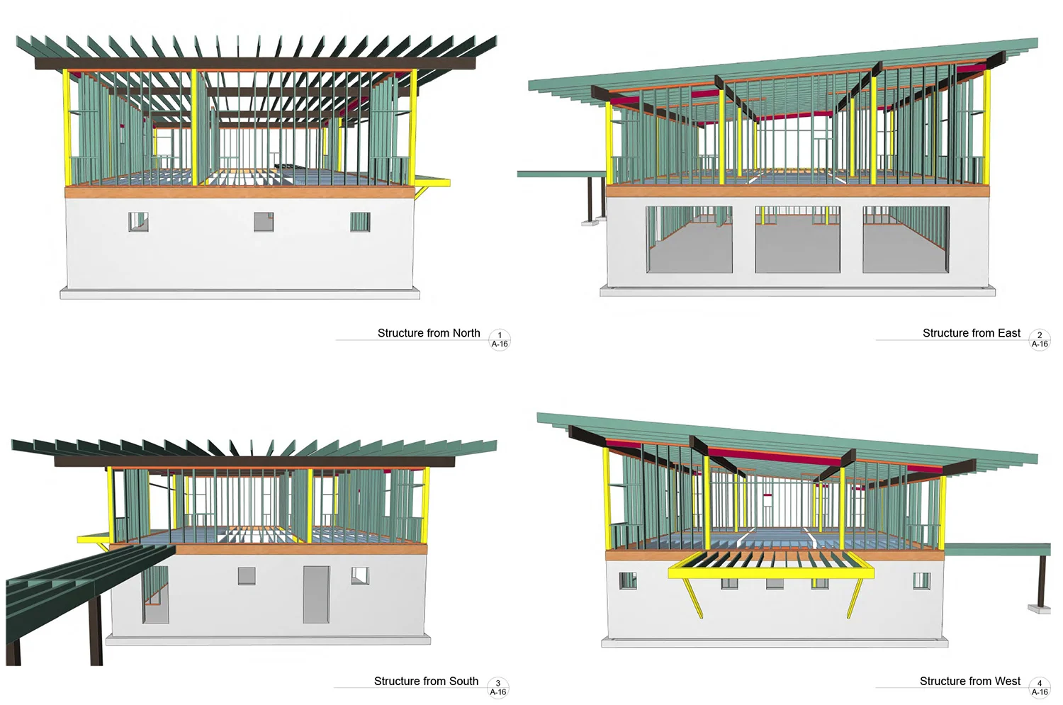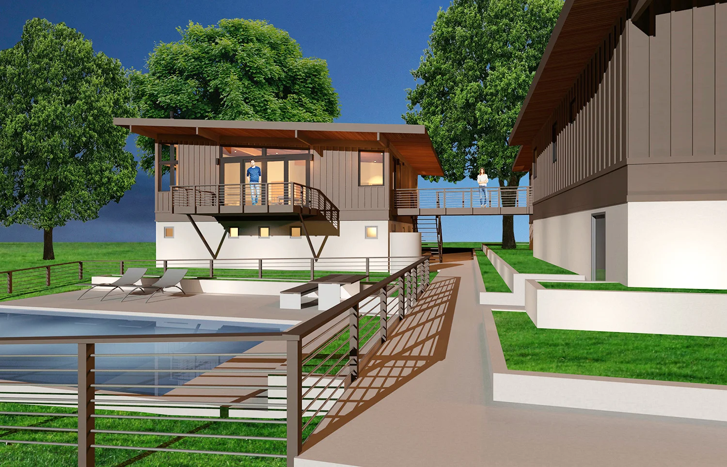 The design of a modern carriage house, pool and landscaping to compliment a recently constructed prefabricated modern home. The carriage house will have a garage and wood shop on the ground floor with a two bedroom guest suite above. A bridge connecting the two units creates a new, more fluid entrance into the main house while creating a pleasant outdoor separation and vista. The great room has a sloped ceiling and large glazed areas calibrated for natural light and views. Construction Documents which included structural drawings were prepared for selection of a contractor using the competitive bid process.